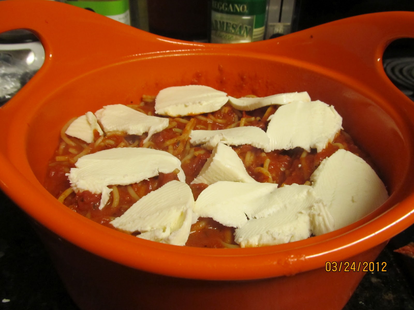 7. Add basil, Parmesan, tomato sauce and a few pieces of the mozzarella to the spaghetti and combine
