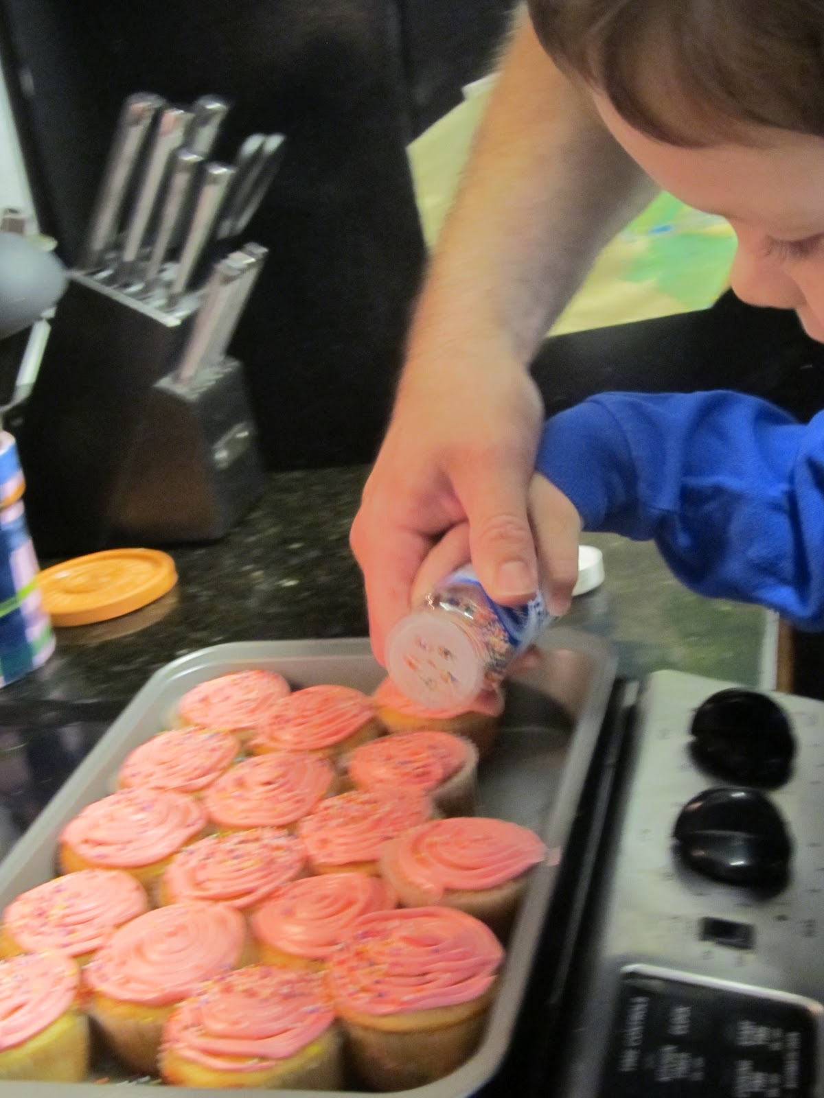 Next, my little helper came and worked with me. My son and husband added the sprinkles. My three year old was so excited to help make cupcakes for his little sister.
