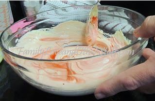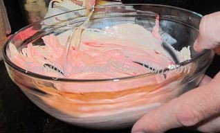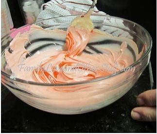 I mixed up the Pillsbury Funfetti cake mix, following the directions on the box. Since the first batch (of another brand) didn’t turn out right, I made sure I followed all the directions. How hard is it to mess up store-bought cake mix? Anyway, moving on. While the cupcakes were in the oven, I had hubby start working on making the Vanilla frosting pink. He used lots of red food coloring to get it just the right shade of pink for Hello Kitty. Here are some pictures.